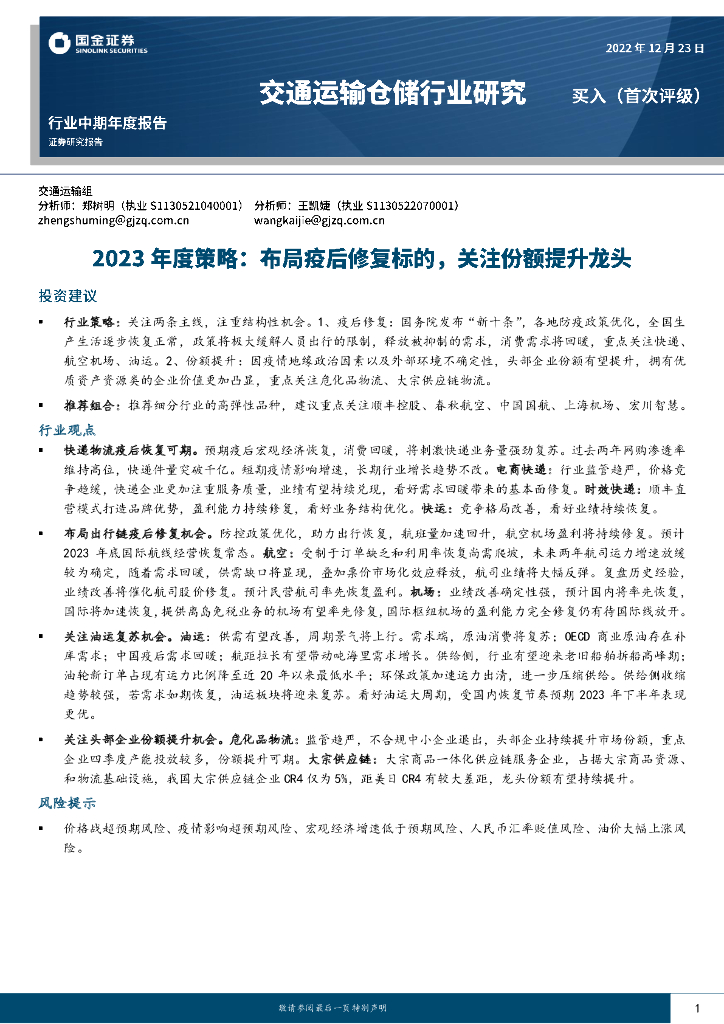 国金证券:交通运输仓储行业研究:2023年度策略:布局疫后修复标的,关注份额提升龙头.pdf