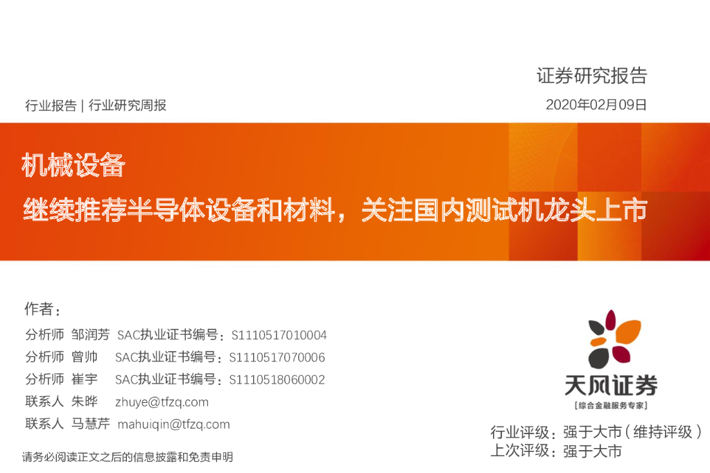 天风证券:机械设备行业研究周报:继续推荐半导体设备和材料,关注国内测试机龙头上市.pdf