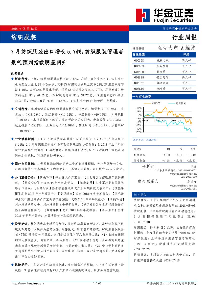 华金证券:纺织服装行业周报:7月纺织服装出口增长5.74%,纺织服装管理者景气预判指数明显回升.pdf