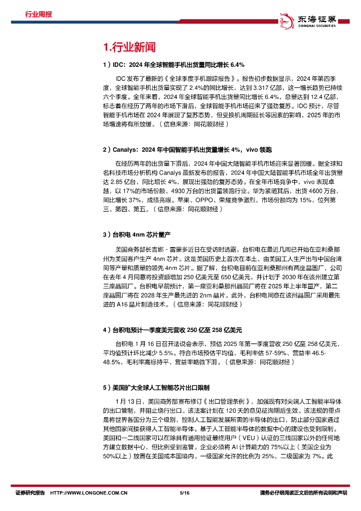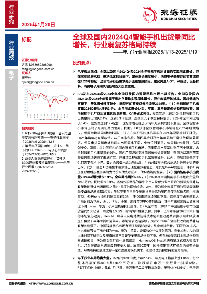 东海证券:电子行业周报:全球及国内2024Q4智能手机出货量同比增长,行业弱复苏格局持续.pdf