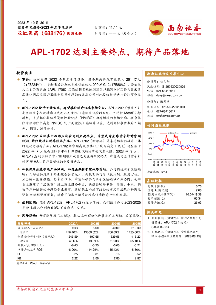 西南证券:亚虹医药(688176)-2023年三季报点评:APL-1702达到主要终点,期待产品落地.pdf