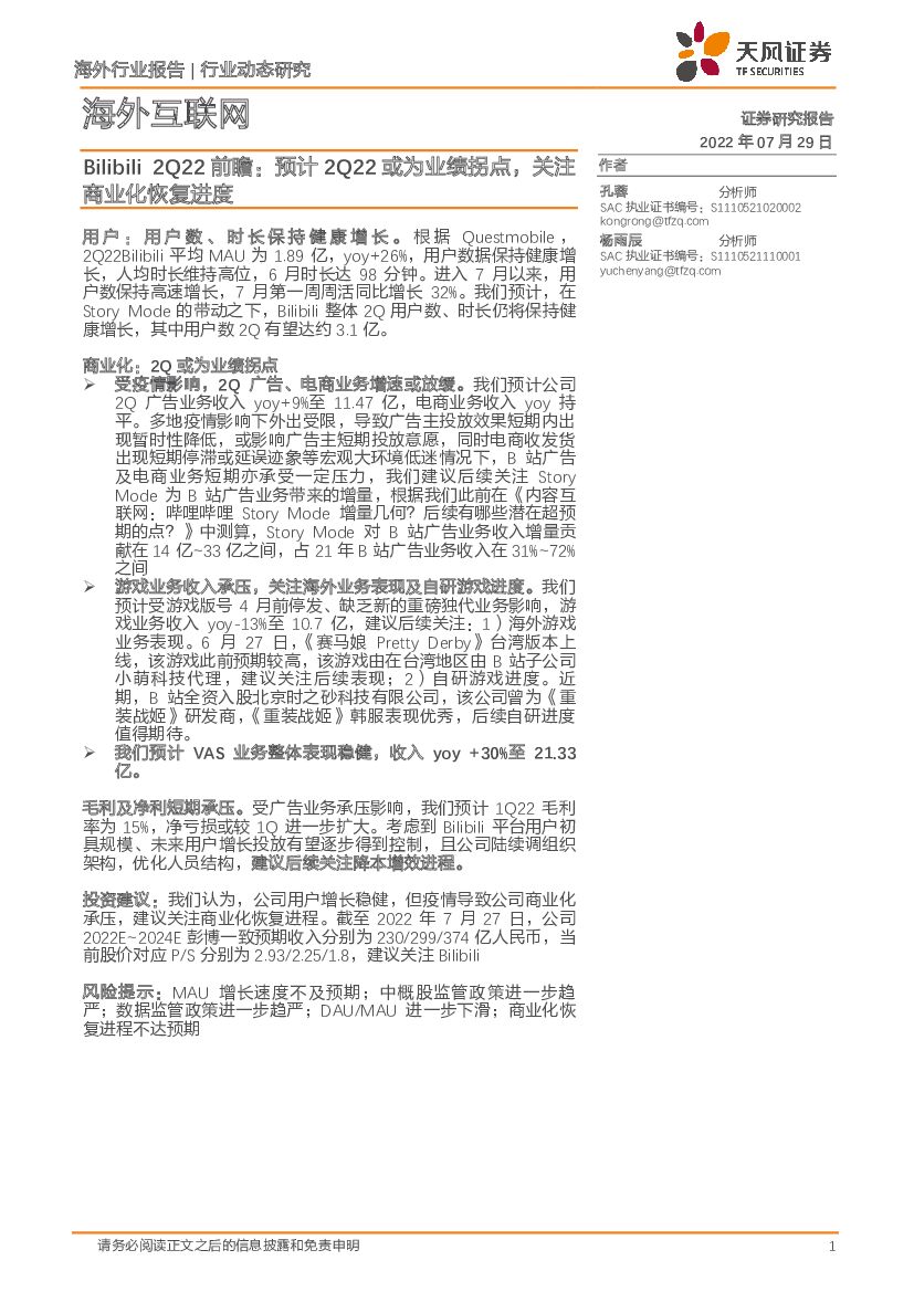 天风证券:海外互联网:Bilibili 2Q22前瞻:预计2Q22或为业绩拐点,关注商业化恢复进度.pdf