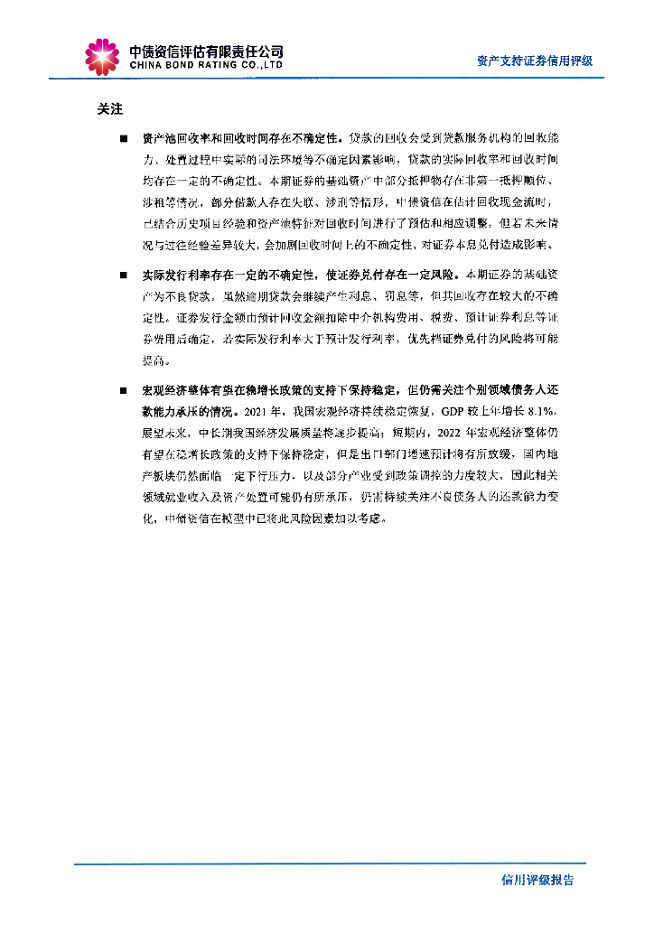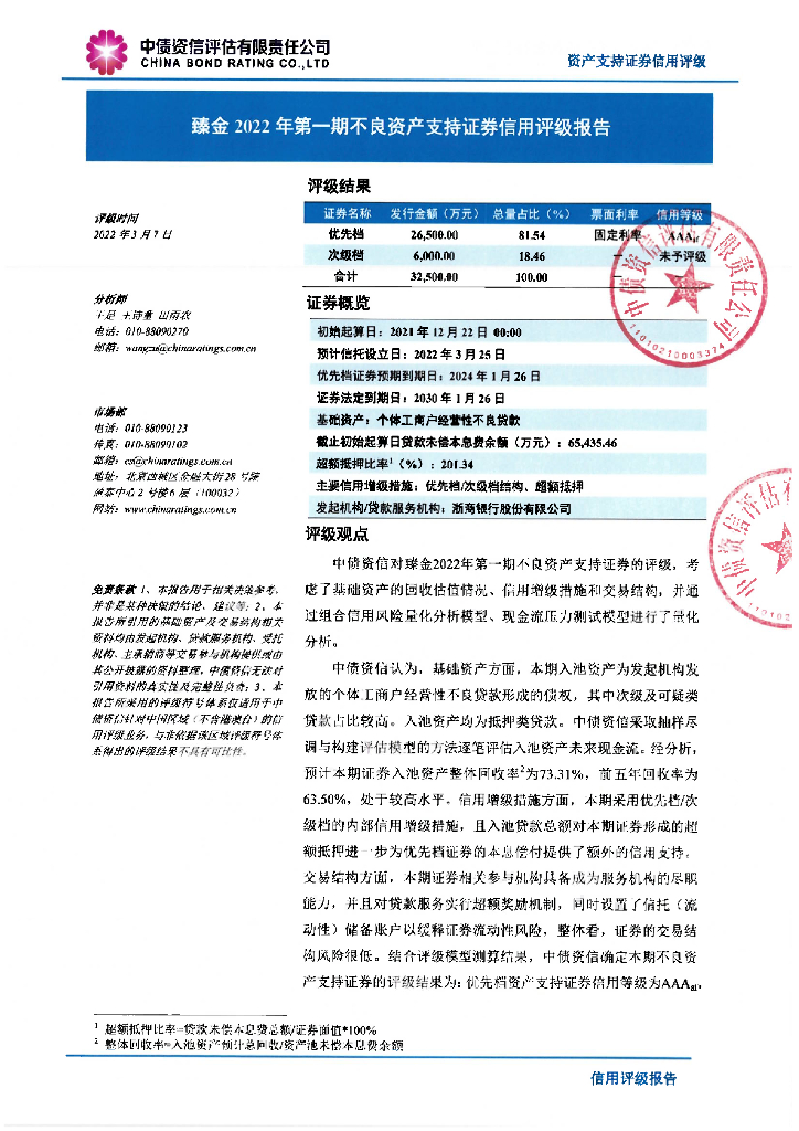 中债资信:臻金2022年第一期不良资产支持证券售前评级报告及持续跟踪评级说明.pdf