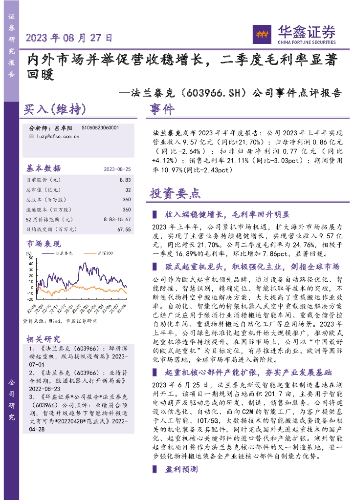 华鑫证券:法兰泰克(603966)-公司事件点评报告:内外市场并举促营收稳增长,二季度毛利率显著回暖.pdf