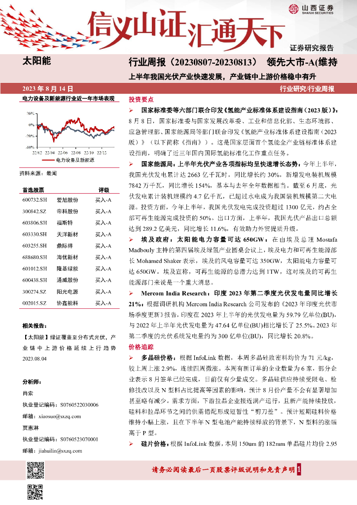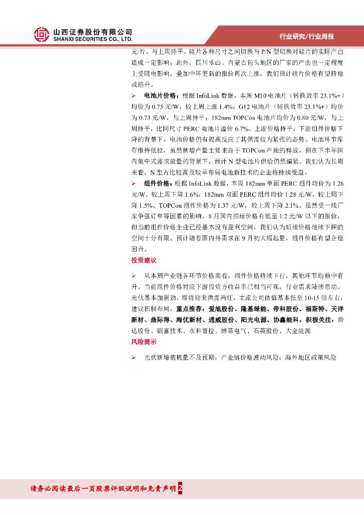 山西证券:太阳能行业周报:上半年我国光伏产业快速发展,产业链中上游价格稳中有升.pdf