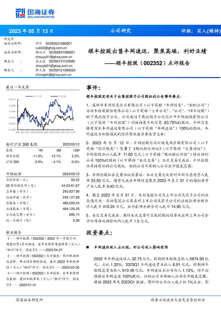 国海证券:点评报告:顺丰控股出售丰网速运,聚焦高端,利好业绩.pdf