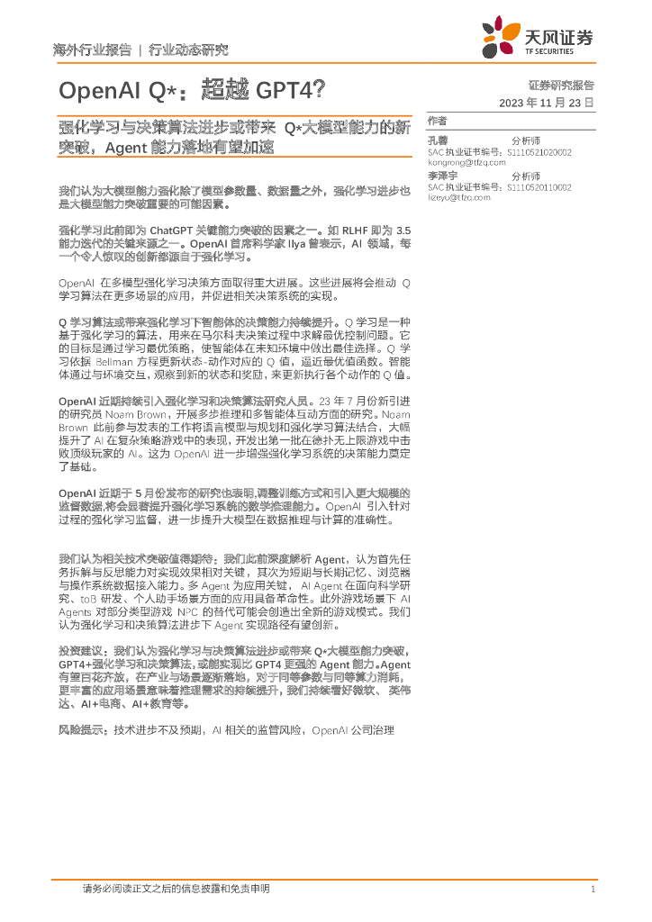 天风证券:OpenAI Q*:超越GPT4?:强化学习与决策算法进步或带来Q*大模型能力的新突破,Agent能力落地有望加速.pdf