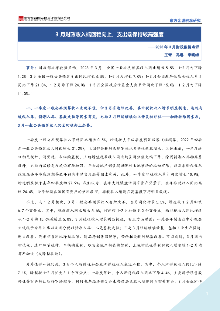 东方金诚:3月财政收入端回稳向上,支出端保持较高强度-2023年3月财政数据点评.pdf