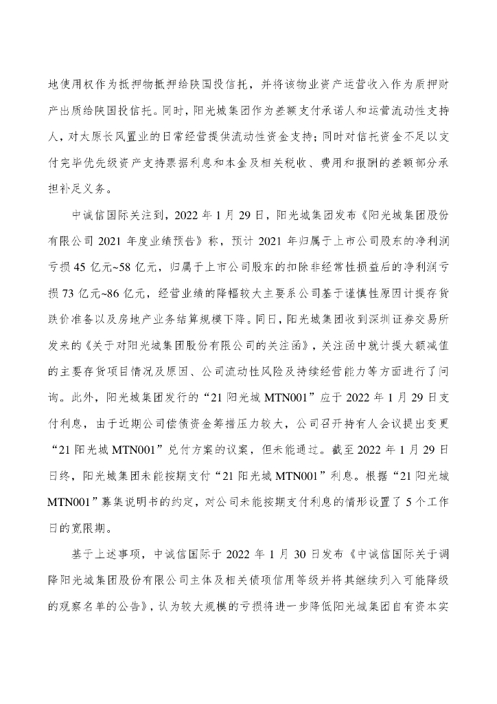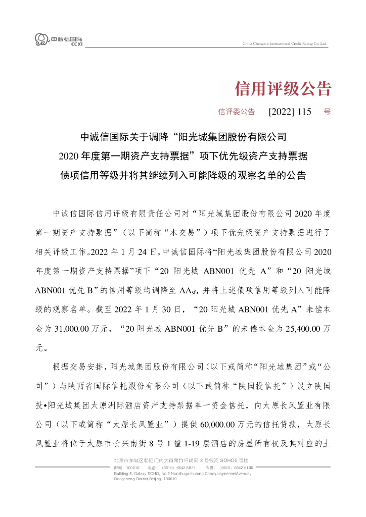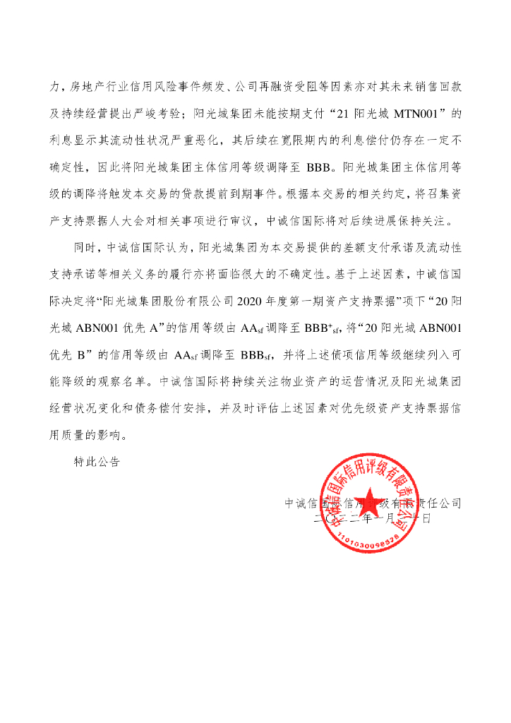 中诚信:中诚信国际关于调降“阳光城集团股份有限公司2020年度第一期资产支持票据”项下优先级资产支持票据债项信用等级并将其继续列入可能降级的观察名单的公告.pdf