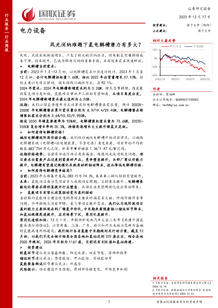 国联证券:电力设备行业周报:风光消纳难题下氢电解槽潜力有多大?.pdf