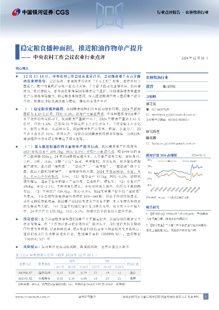 中国银河:中央农村工作会议农业行业点评:稳定粮食播种面积,推进粮油作物单产提升.pdf