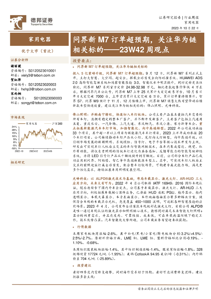 德邦证券:家用电器23W42周观点:问界新M7订单超预期,关注华为链相关标的.pdf