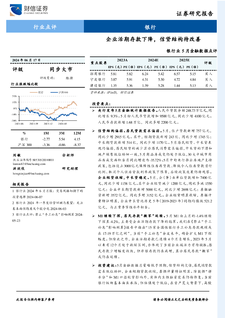 财信证券:银行业5月金融数据点评:企业活期存款下降,信贷结构待改善.pdf
