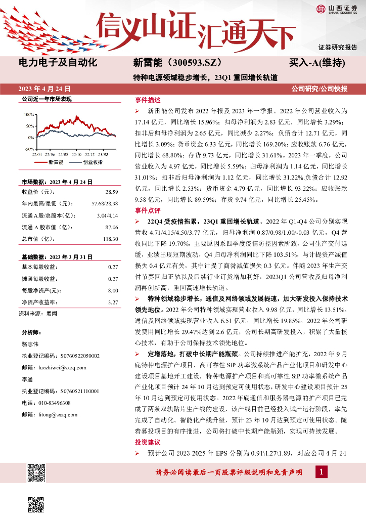 山西证券:新雷能(300593)-特种电源领域稳步增长,23Q1重回增长轨道.pdf