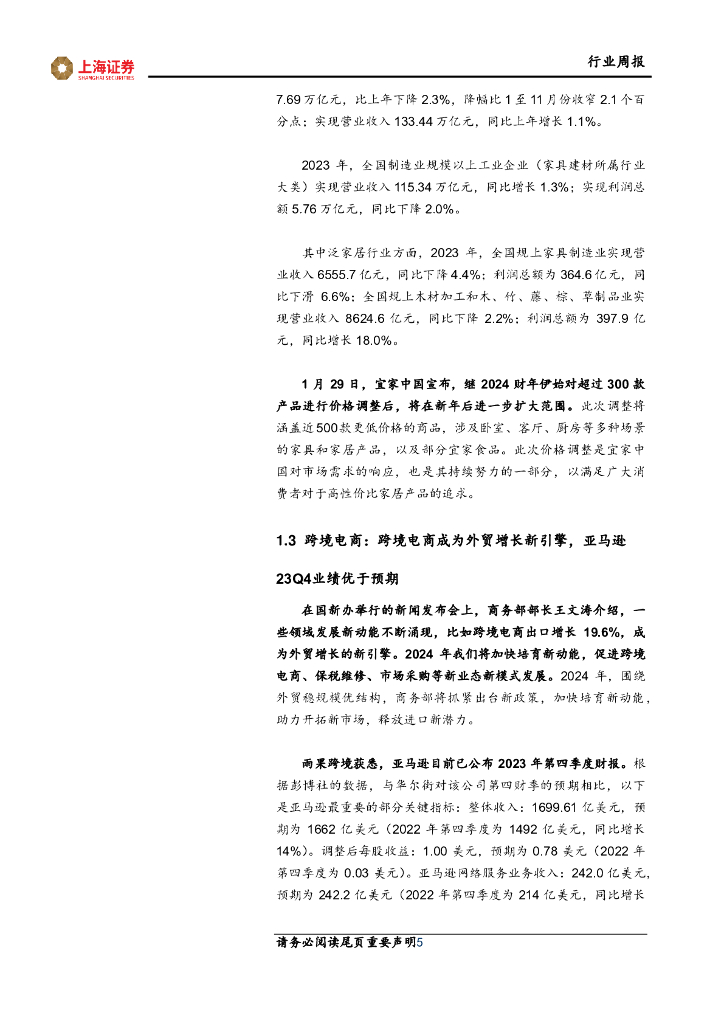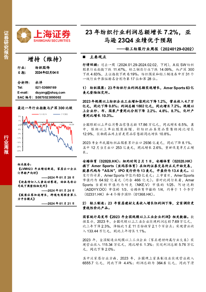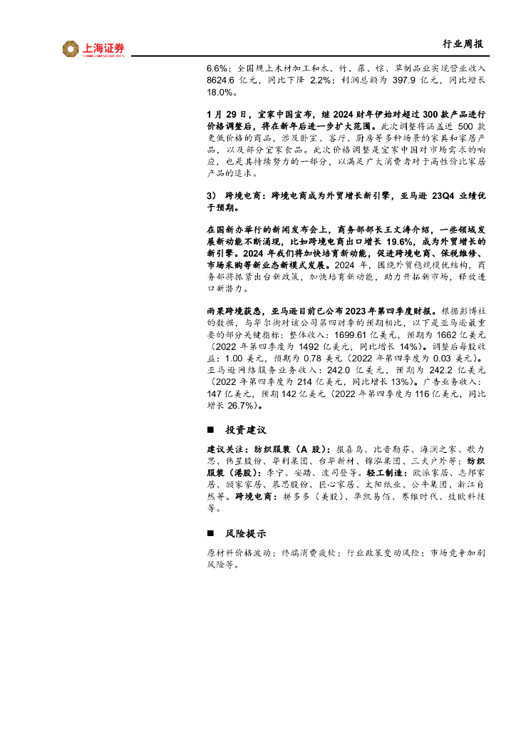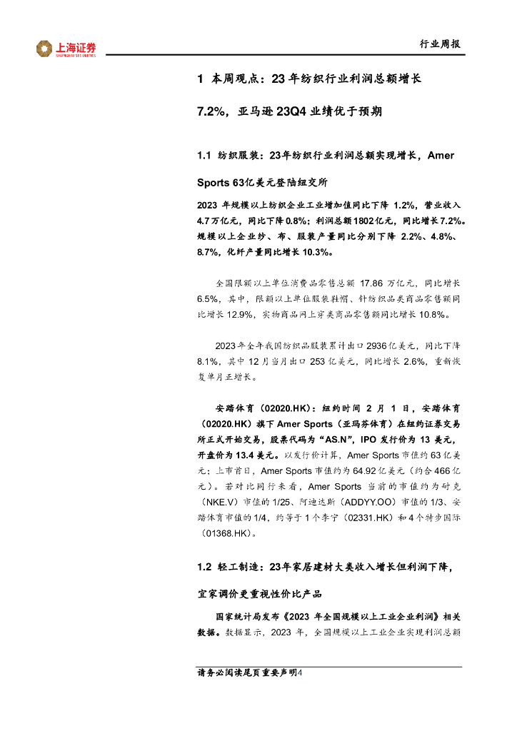 上海证券:轻工纺服行业周报:23年纺织行业利润总额增长7.2%,亚马逊23Q4业绩优于预期.pdf