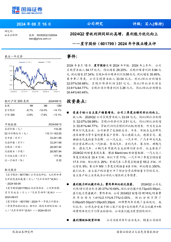 国海证券:星宇股份(601799)-2024年中报业绩点评:评级:买入(维持)2024Q2营收利润同环比高增,盈利能力优化向上.pdf