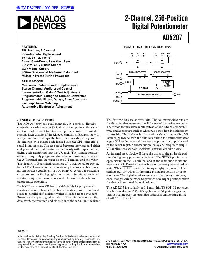 ANALOG DEVICES AD5207 2-Channel, 256-Position Digital Potentiometer 数据手册.pdf