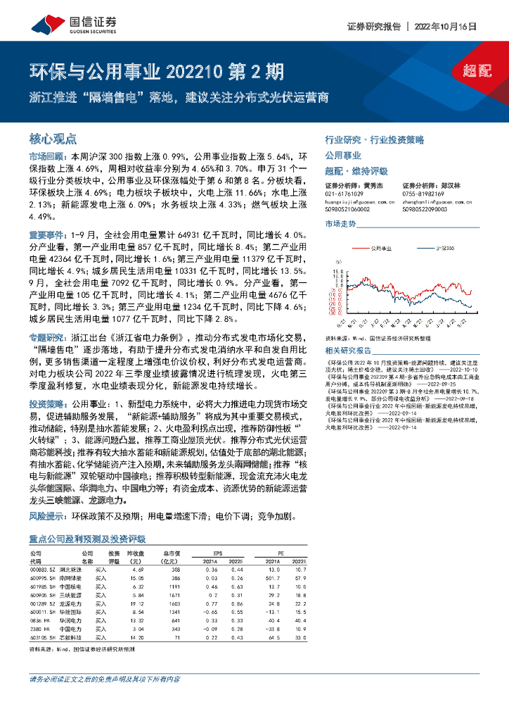 国信证券:环保与公用事业202210第2期:浙江推进“隔墙售电”落地,建议关注分布式光伏运营商.pdf