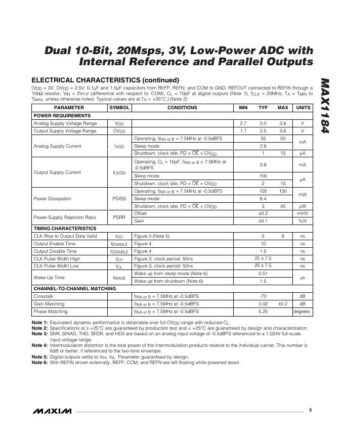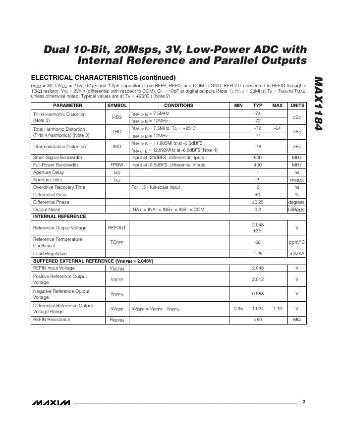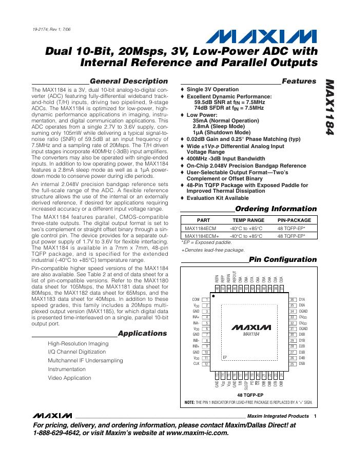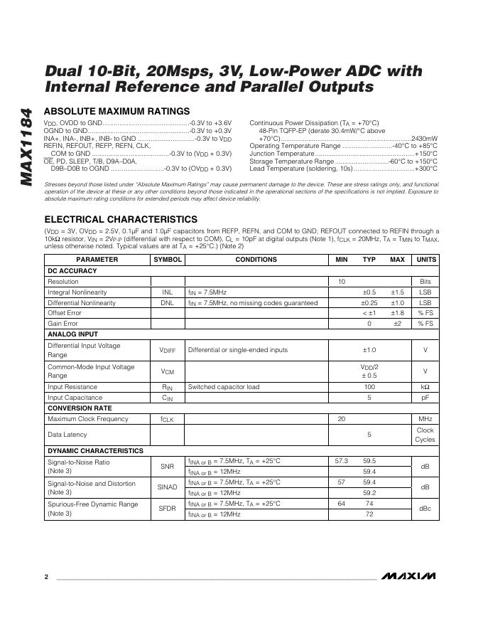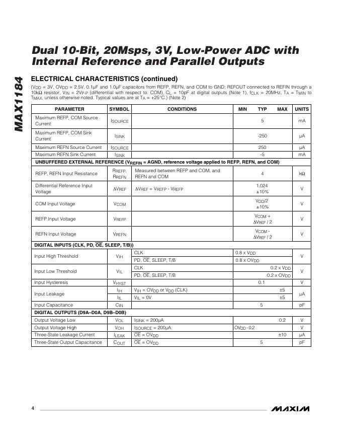 MAXIM MAX1184 Dual 10-Bit, 20Msps, 3V, Low-Power ADC with Internal Reference and Parallel Outputs 数据手册.pdf