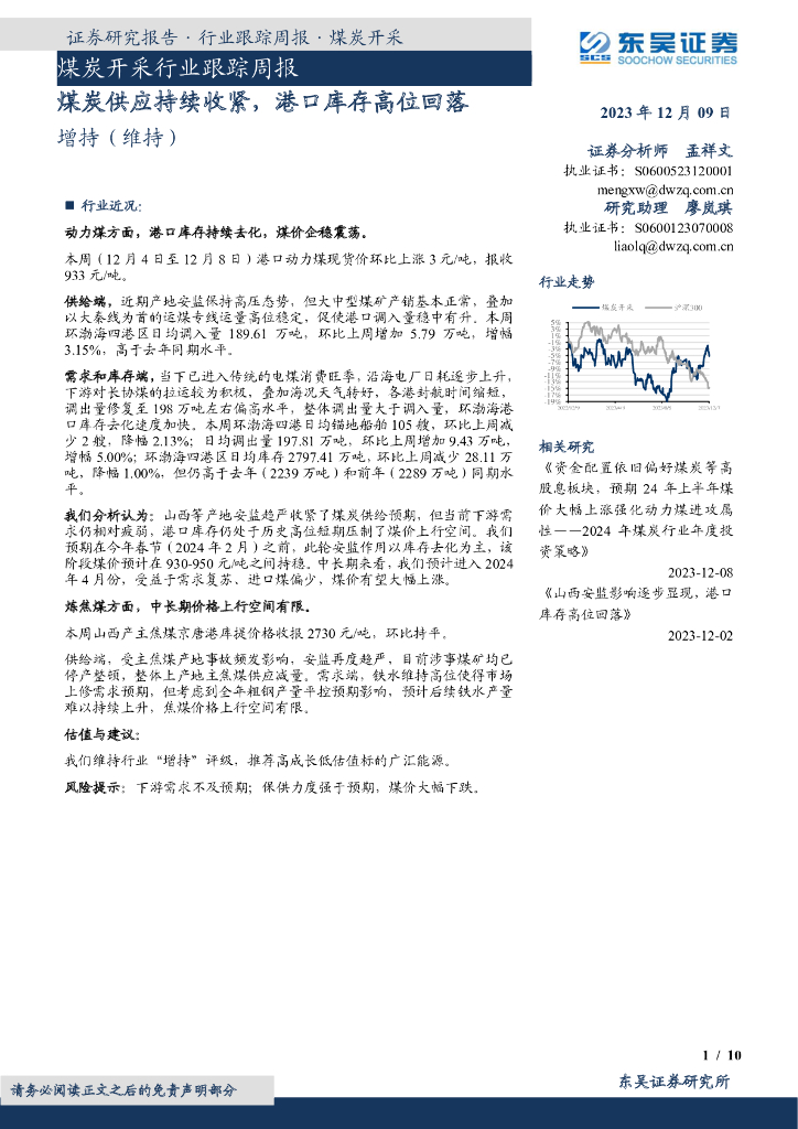 东吴证券:煤炭开采行业跟踪周报:煤炭供应持续收紧,港口库存高位回落.pdf
