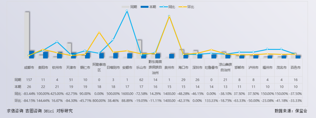 从销量分布来看,该企业市场高度集中,销量主要来源于二三线城市,前20城市占总销量的121.07%。一线城市仅一地入榜,新一线城市入围2个,二三线城市入围17个。成都市本期贡献264辆,占比9.96%排第1,同比增长-83.44%辆,环比增长-84.15%,占当地市场份额1.06%,较上年同期缩小-2.08个百分点。安顺市综合表现较为突出,本期贡献17辆,同比增长1600.00%,环比增长88.89%,市场份额7.02%,较上同期扩大6.82个百分点。