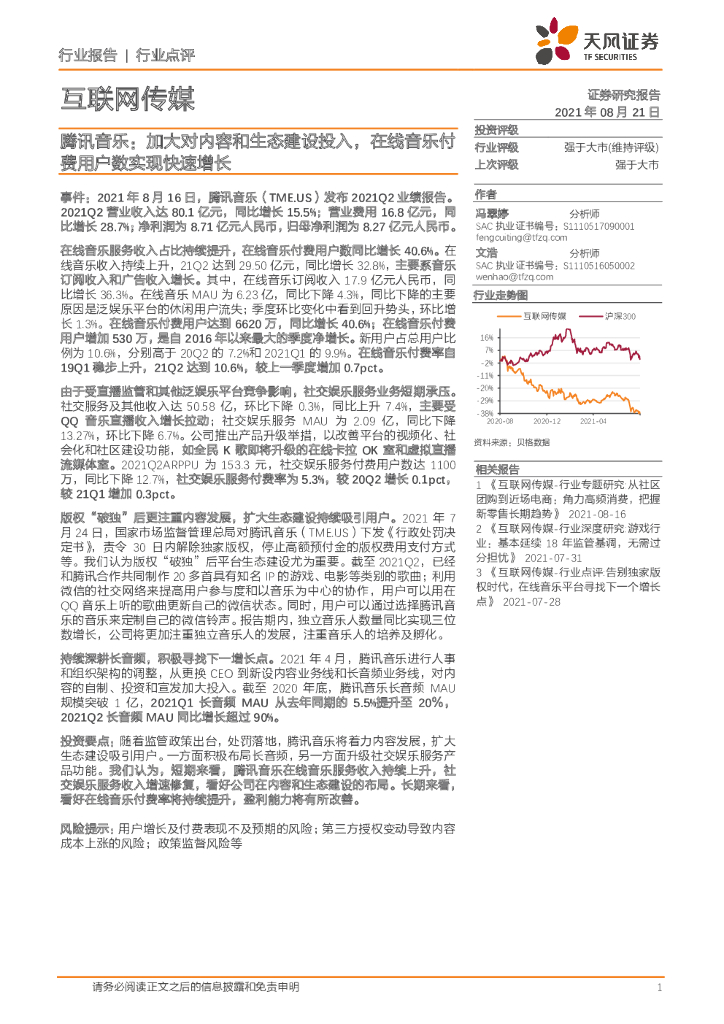 天风证券:互联网传媒:腾讯音乐:加大对内容和生态建设投入,在线音乐付费用户数实现快速增长.pdf