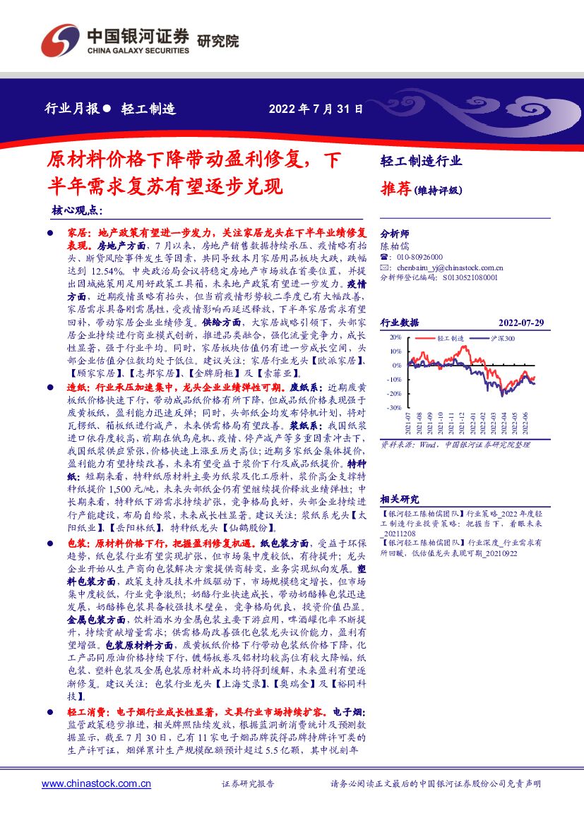 中国银河:轻工制造行业月报:原材料价格下降带动盈利修复,下半年需求复苏有望逐步兑现.pdf