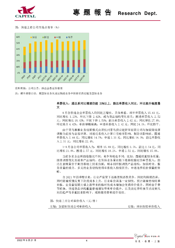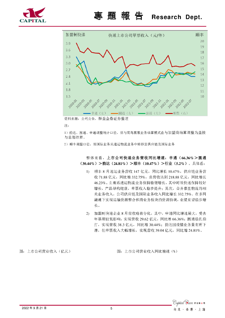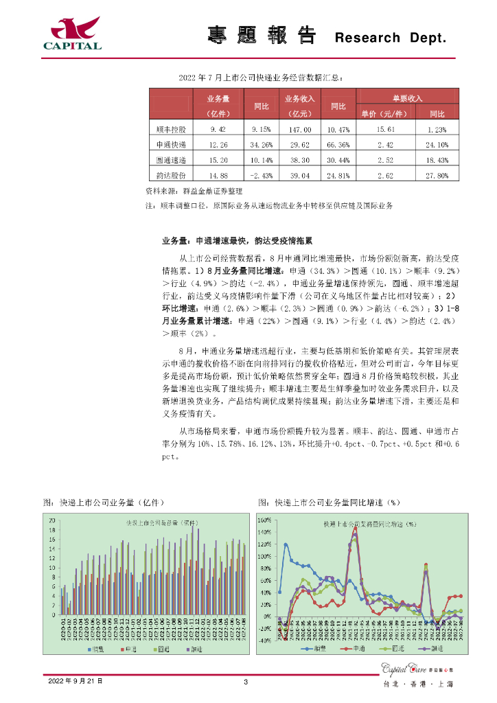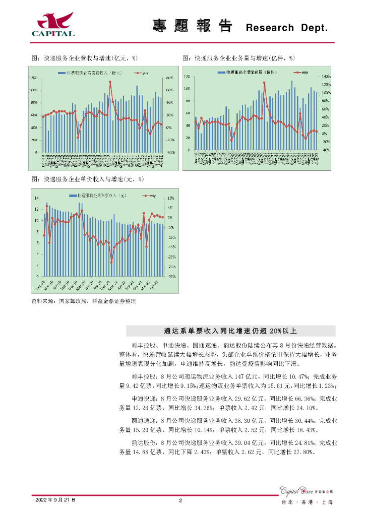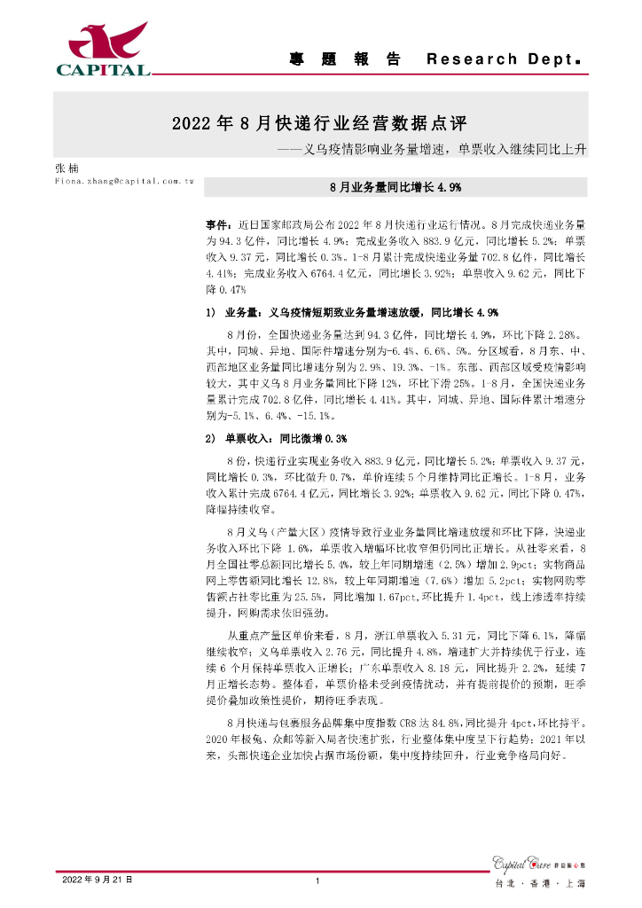 群益证券:2022年8月快递行业经营数据点评:义乌疫情影响业务量增速,单票收入继续同比上升.pdf