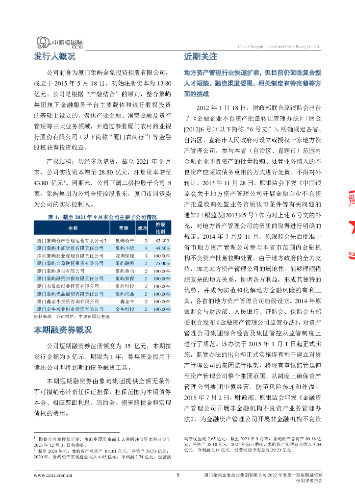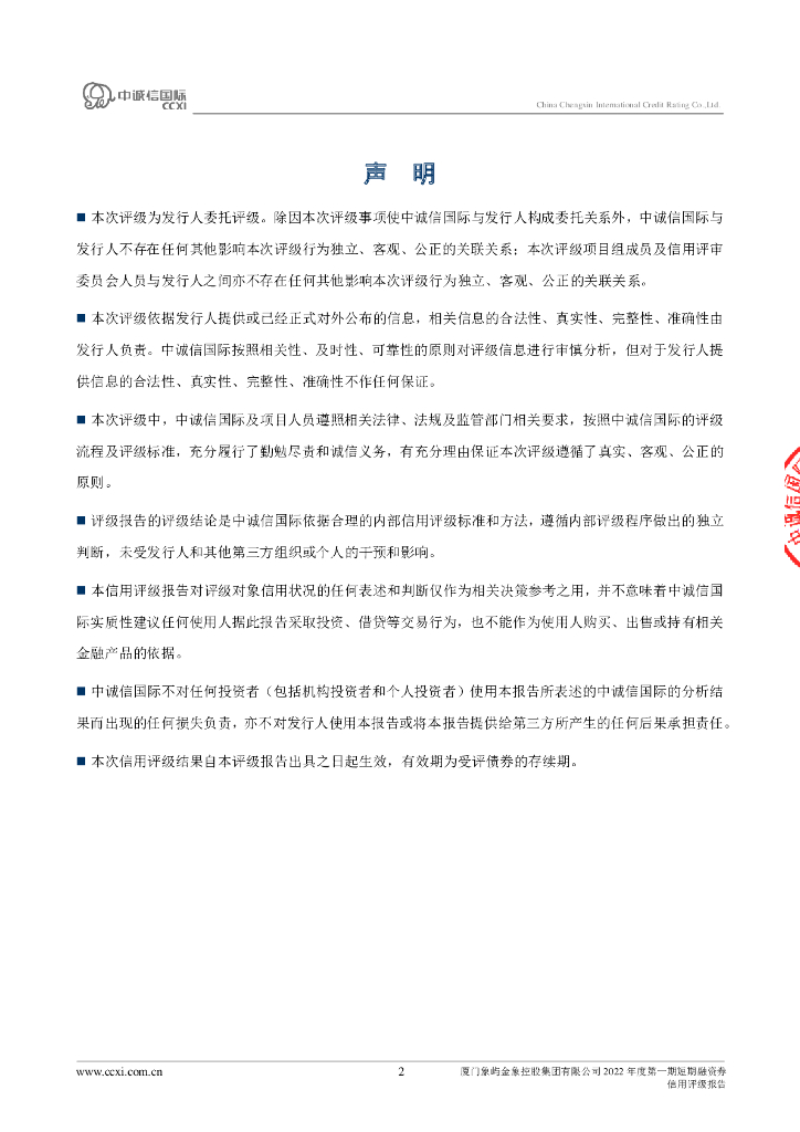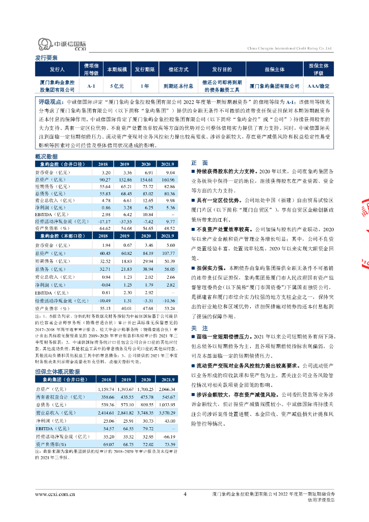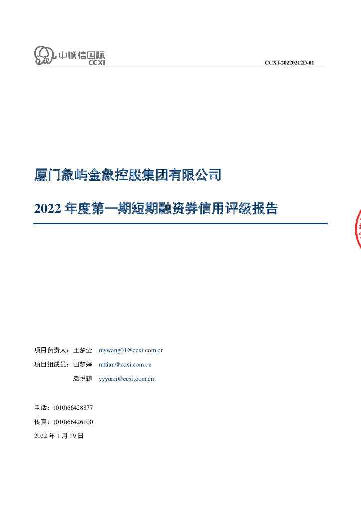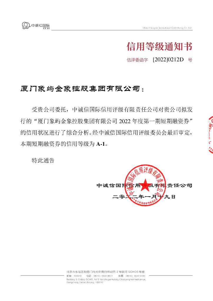 中诚信:厦门象屿金象控股集团有限公司2022年度第一期短期融资券信用评级报告.pdf