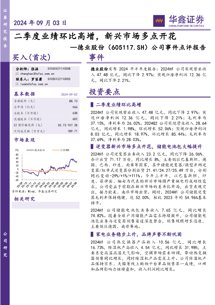 华鑫证券:德业股份(605117)-公司事件点评报告:二季度业绩环比高增,新兴市场多点开花.pdf