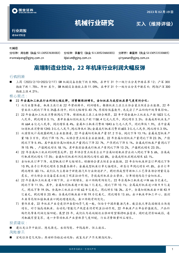 国金证券:机械行业研究:高端制造业拉动,22年机床行业利润大幅反弹.pdf