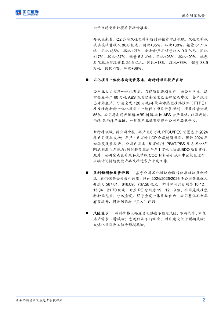 国海证券:金发科技(600143)-公司点评:主业改性塑料表现亮眼,2024Q2业绩环比改善.pdf