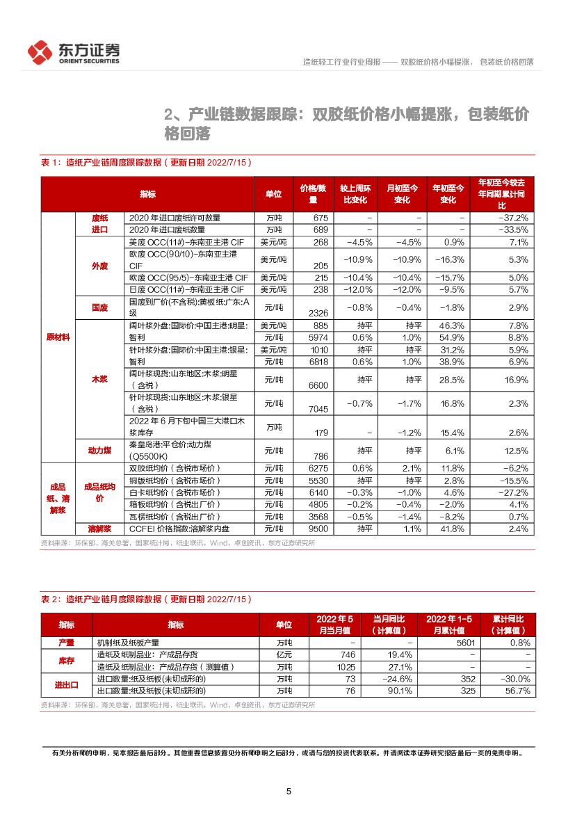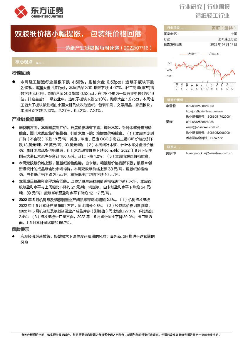东方证券:造纸产业链数据每周速递:双胶纸价格小幅提涨,包装纸价格回落.pdf