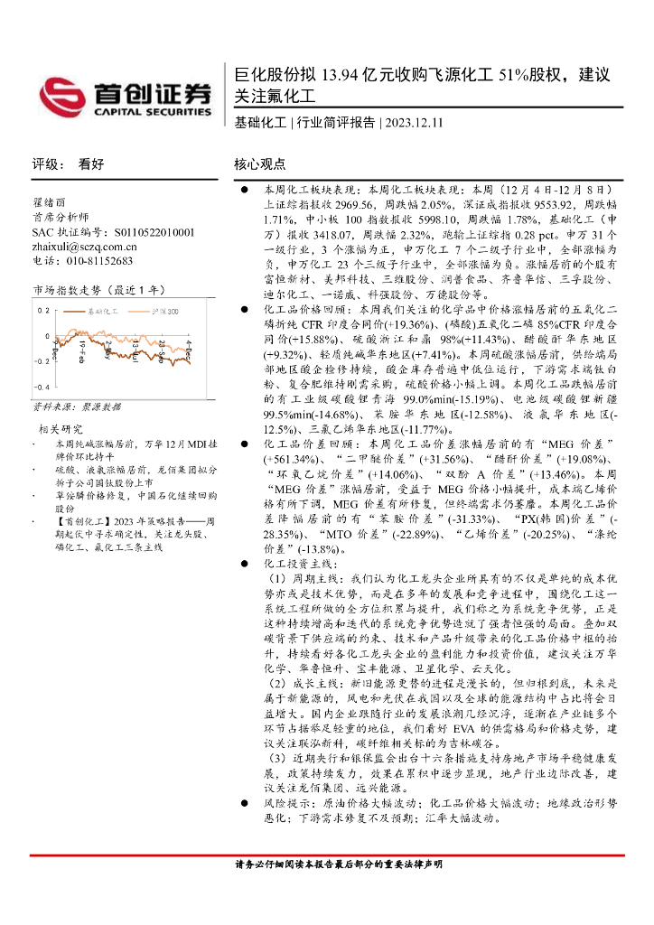 首创证券:基础化工行业简评报告:巨化股份拟13.94亿元收购飞源化工51%股权,建议关注氟化工.pdf