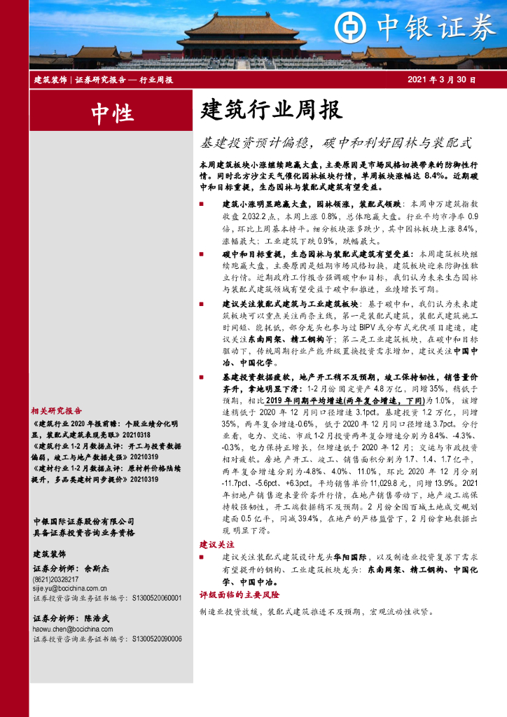 中银证券:建筑行业周报:基建投资预计偏稳,碳中和利好园林与装配式.pdf