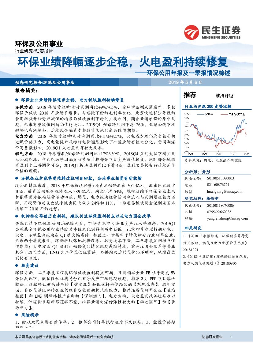 民生证券:环保公用年报及一季报情况综述:环保业绩降幅逐步企稳,火电盈利持续修复.pdf