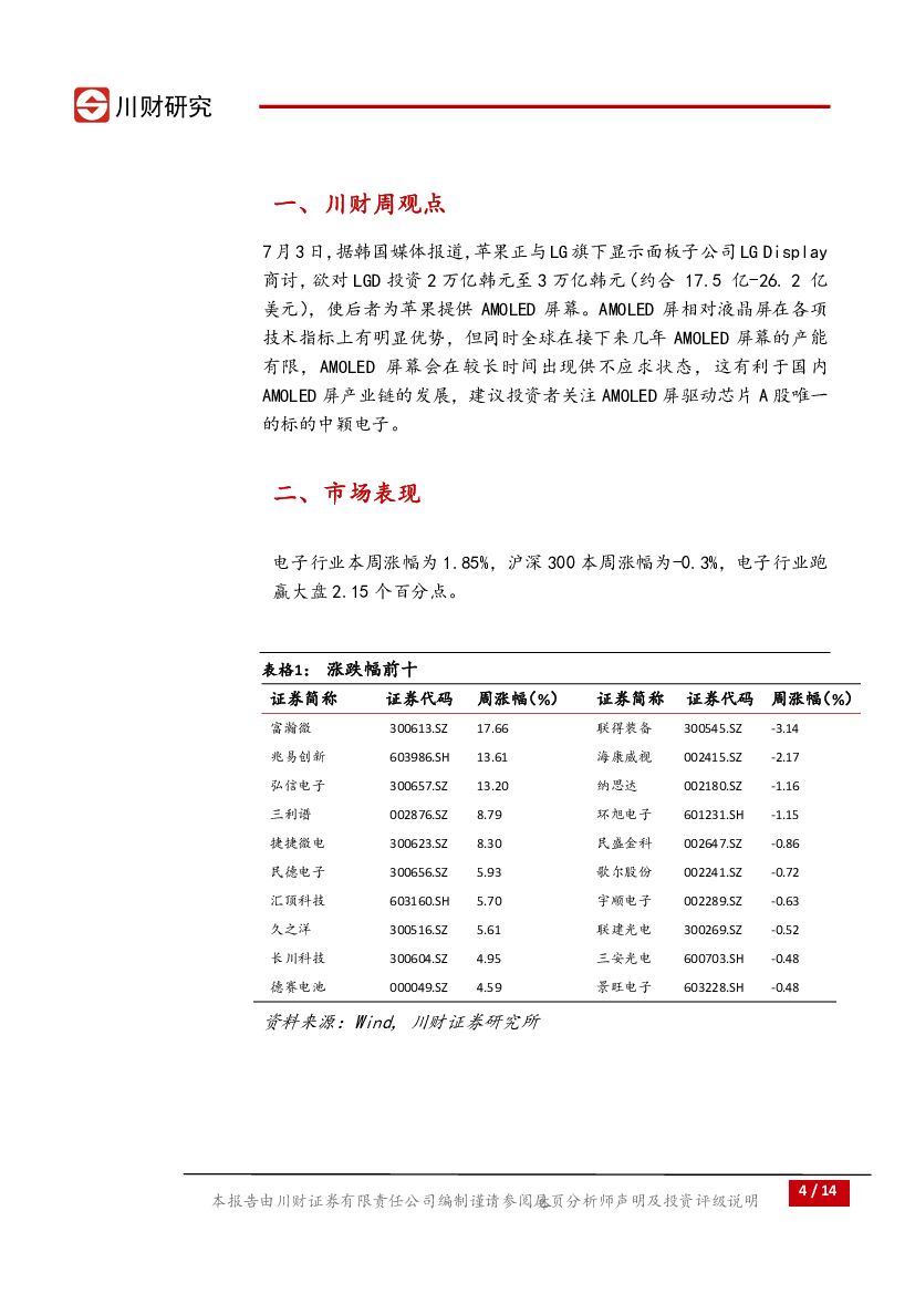 川财证券:电子行业周报:AMOLED屏将在较长时间供不应求,建议关注中颖电子.pdf