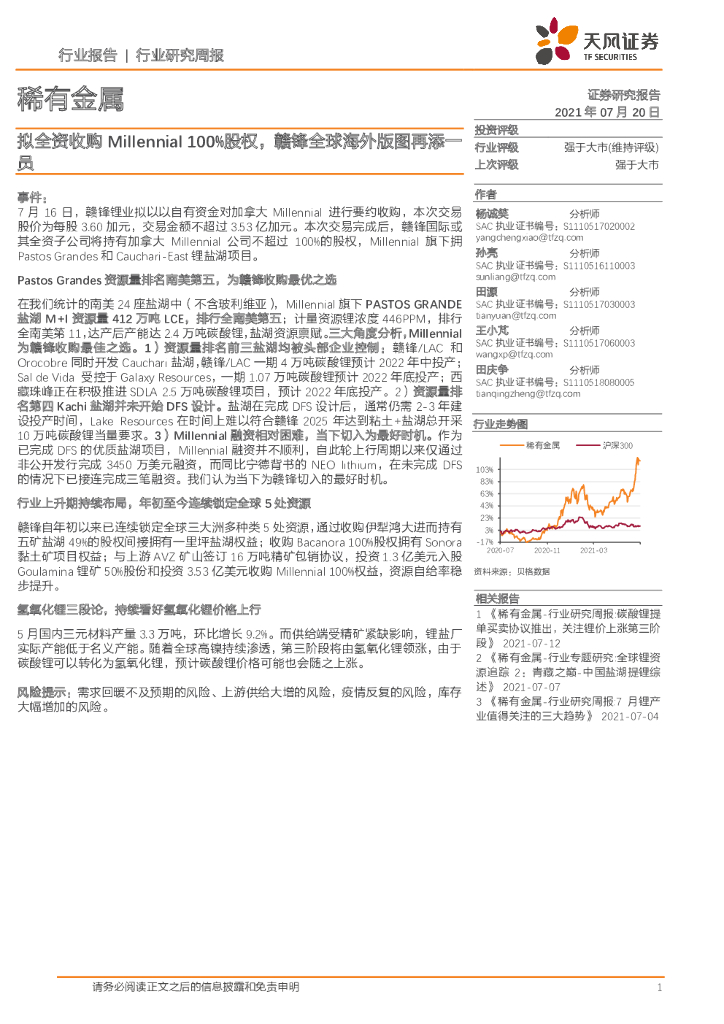 天风证券:稀有金属行业研究周报:拟全资收购Millennial100%股权,赣锋全球海外版图再添一员.pdf