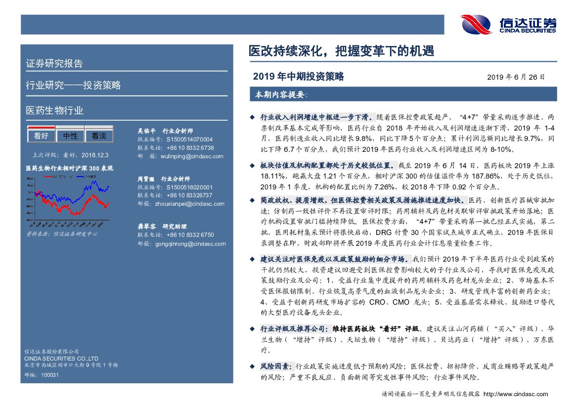 信达证券:医药生物行业2019年中期投资策略:医改持续深化,把握变革下的机遇.pdf