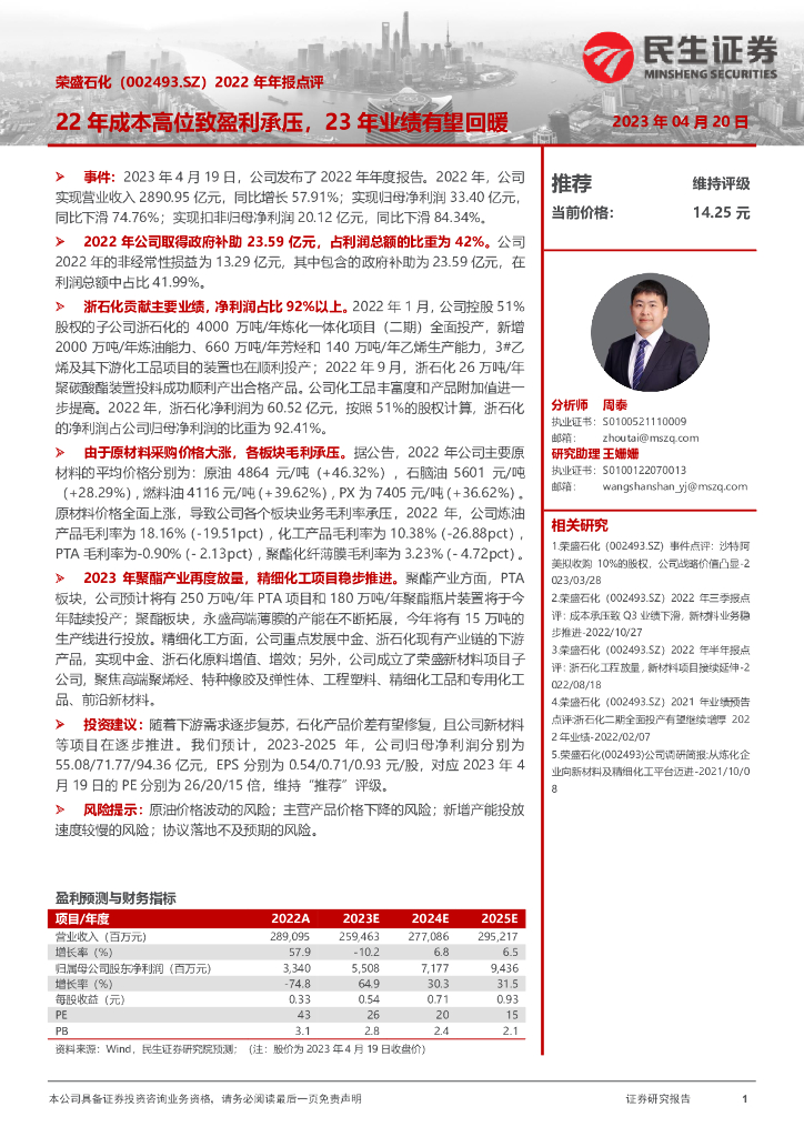 民生证券:荣盛石化(002493)-2022年年报点评:22年成本高位致盈利承压,23年业绩有望回暖.pdf