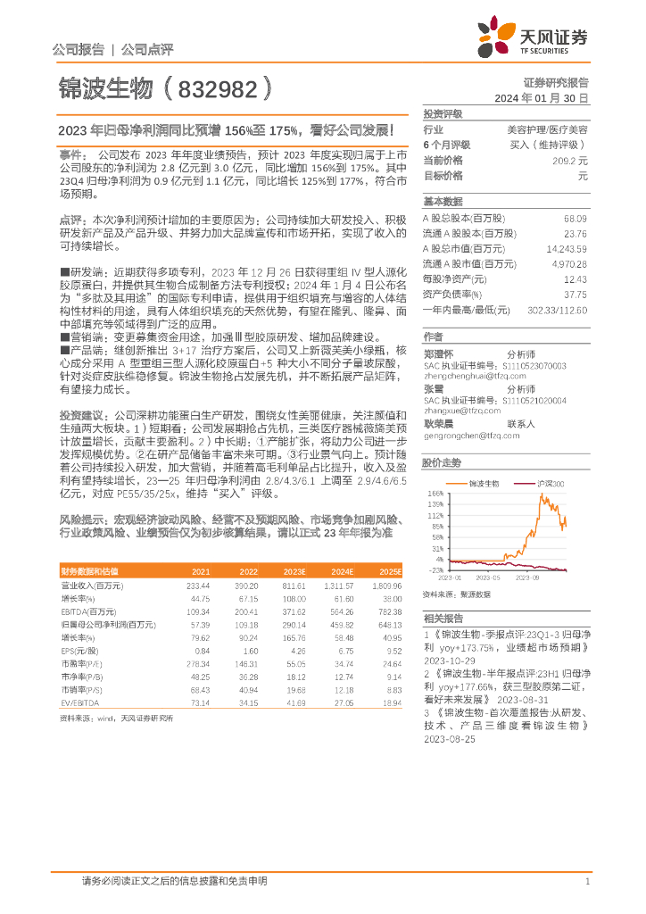 天风证券:锦波生物(832982)-2023年归母净利润同比预增156%至175%,看好公司发展!.pdf