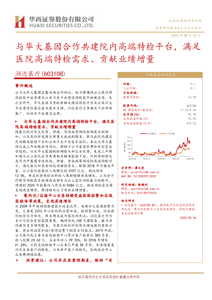 华西证券:润达医疗(603108)-与华大基因合作共建院内高端特检平台,满足医院高端特检需求、贡献业绩增量.pdf