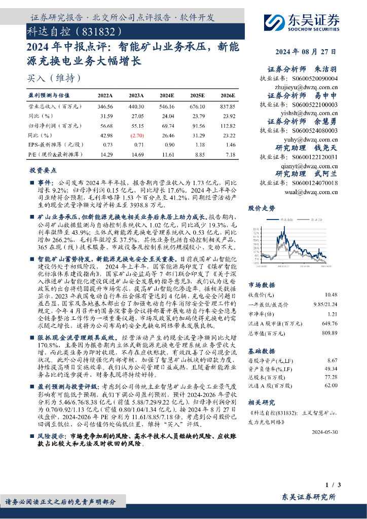 东吴证券:科达自控(831832)-2024年中报点评:智能矿山业务承压,新能源充换电业务大幅增长.pdf