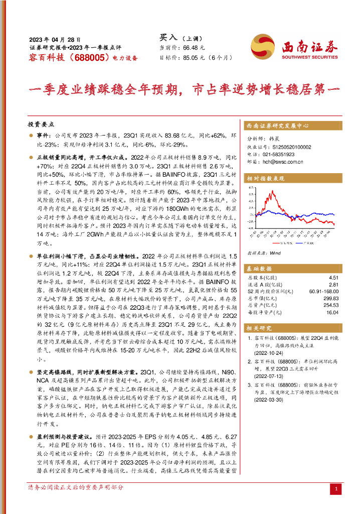 西南证券:容百科技(688005)-一季度业绩踩稳全年预期,市占率逆势增长稳居第一.pdf