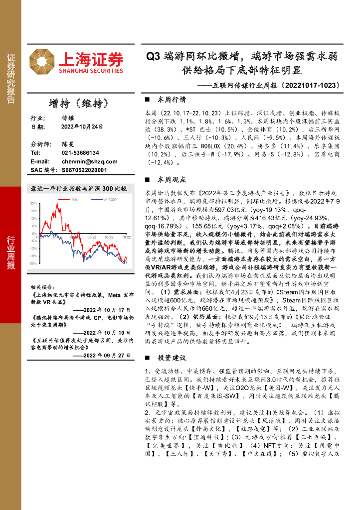 上海证券:互联网传媒行业周报:Q3端游同环比微增,端游市场强需求弱供给格局下底部特征明显.pdf