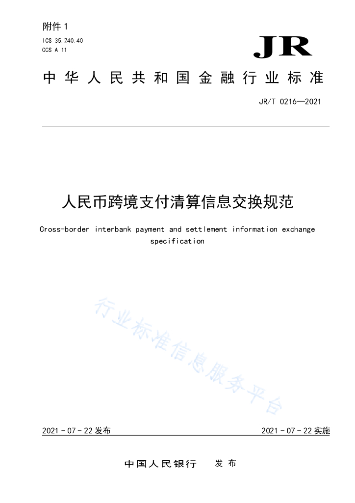 中国人民银行:人民币跨境支付清算信息交换规范(JR/T 0216-2021).pdf