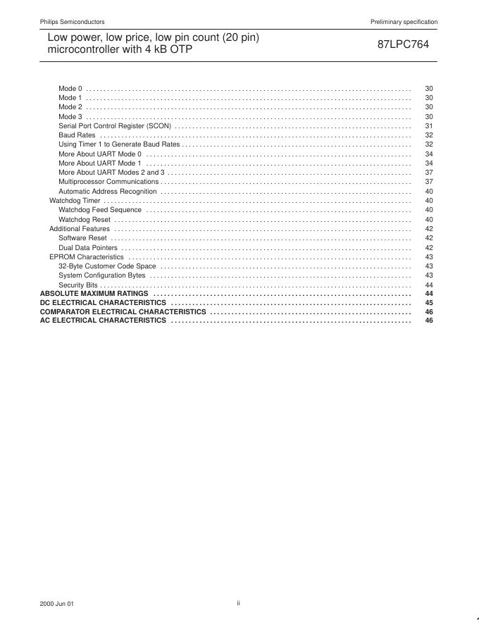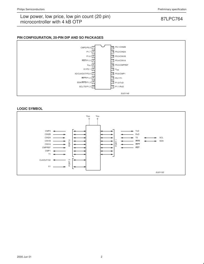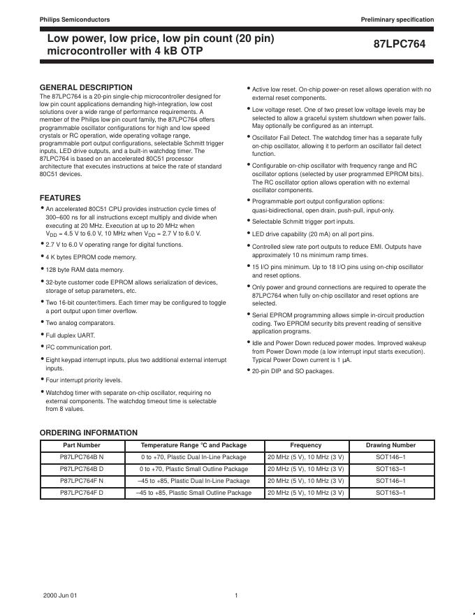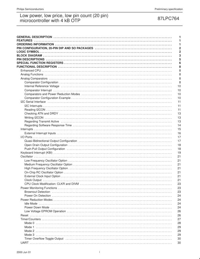 PHILIPS 87LPC764 Low power, low price, low pin count (20 pin) microcontroller with 4 kB OTP 数据手册.pdf