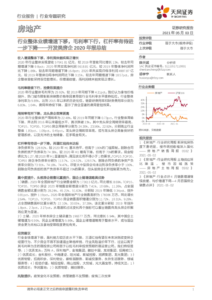 天风证券:房地产行业专题研究:开发类房企2020年报总结-行业整体业绩增速下移,毛利率下行,杠杆率有待进一步下降.pdf
