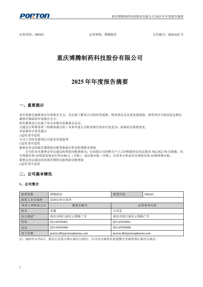 300363-博腾股份:2025年年度报告摘要.pdf
