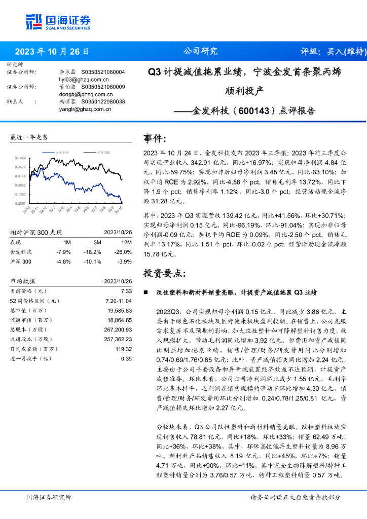 国海证券:金发科技(600143)-点评报告:Q3计提减值拖累业绩,宁波金发首条聚丙烯顺利投产.pdf